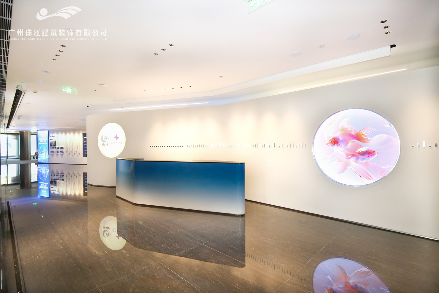海大科学园的建筑外观采用现代简约的设计风格,以玻璃幕墙为主,搭配金属框架,展现出通透、轻盈的视觉效果。建筑线条流畅,园内设置了多个功能区域,咨询台、休息区、会议室、展示区以及洽谈区等主要重点区域。